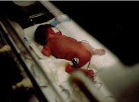 Jarom in the isolet; notice that they used a doctor's mask as a diaper when he was under the ultraviolet light for bilirubin treatments